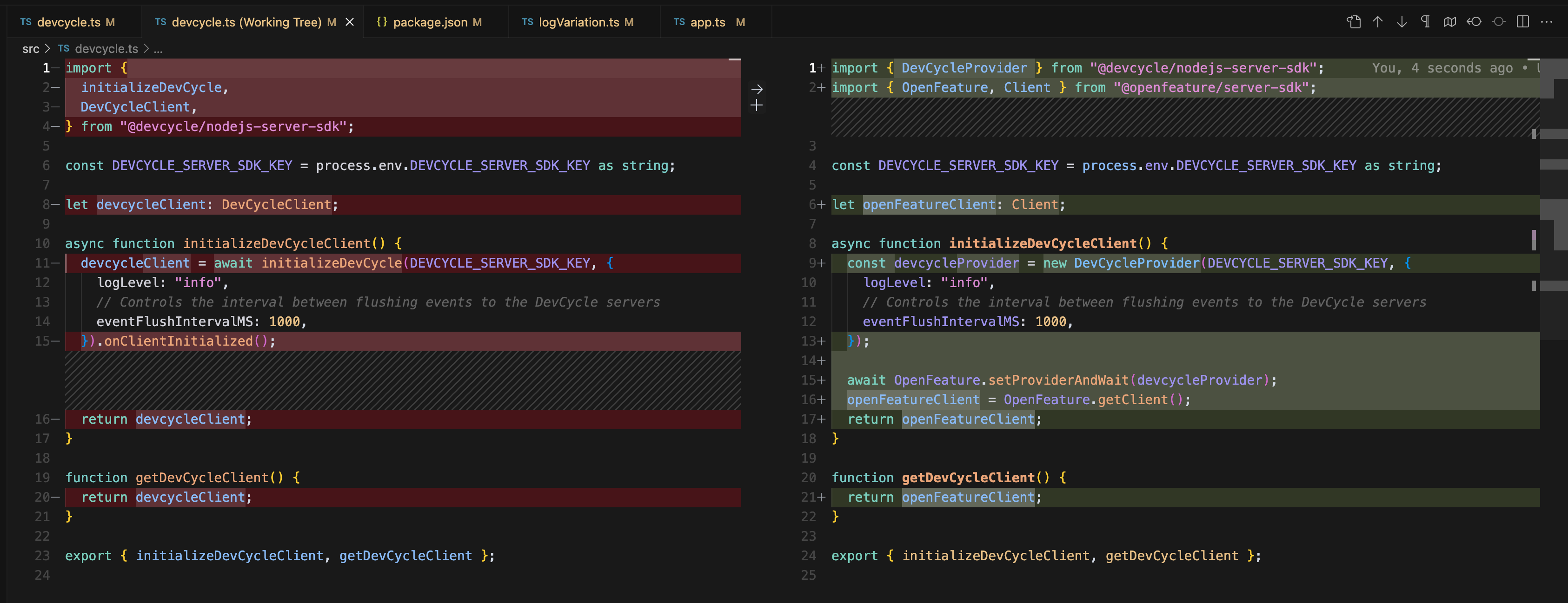 • Initialization Transform - transforms the SDK initialization from using initializeDevCycle() to setting up the DevCycleProvider and creating the OpenFeature Client